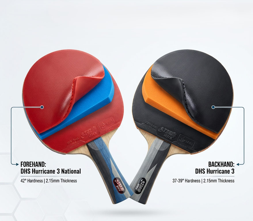 • Forehand: DHS Hurricane 3 National (Blue sponge, 42°, 2.15mm)