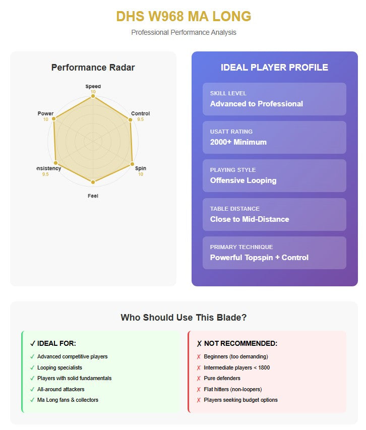 The DHS W968 Ma Long Olympic "Gold Collection Box" represents the pinnacle of offensive blade technology. It's a near-perfect blade that's hard to pick out flaws, offering a comprehensive performance that's both good at offense and defense