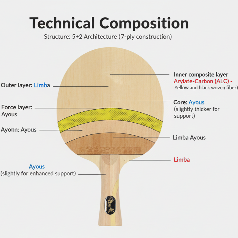 Arylate-Carbon Technology: The blade incorporates inner-layer Arylate-Carbon technology, enhancing stability and dwell time while maintaining a crisp feel. This unique fiber arrangement provides exceptional elasticity with a softer sensation compared to traditional carbon constructions.